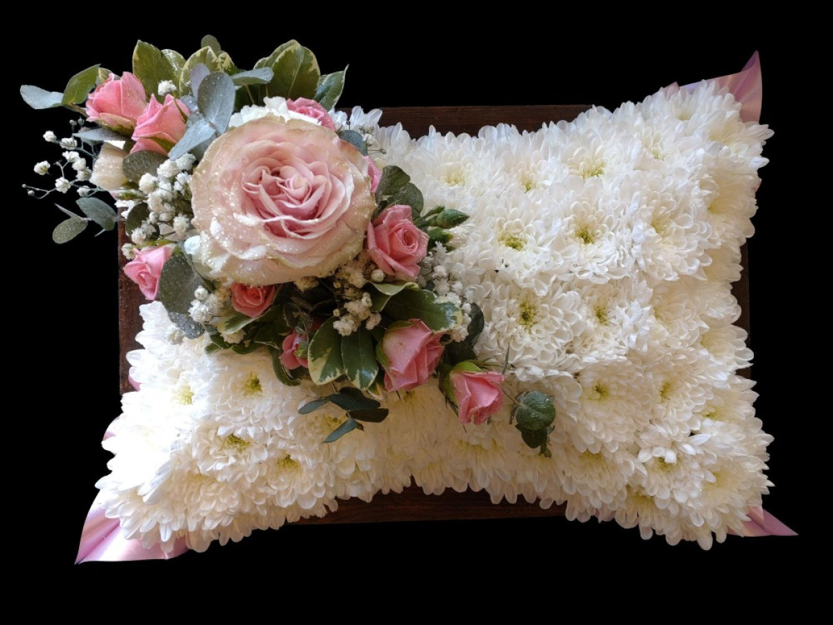 Pillows are a perfect option for "laying someone to rest". Traditionally made with white chrysanthemum base, a ribbon or foliage edge with a spray of your choice. The size of the design refers to the longest edge.